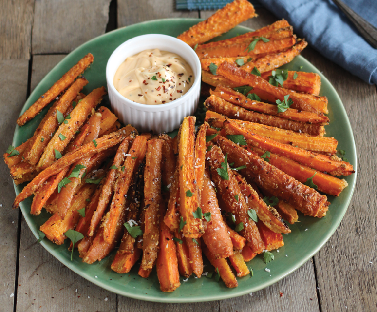 Pak een grote bakplaat, leg er bakpapier op Verspreid de wortelpatat over de bakplaat. Let op: patatjes mogen elkaar niet aanraken. (Anders wordt die kant niet zo knapperig)